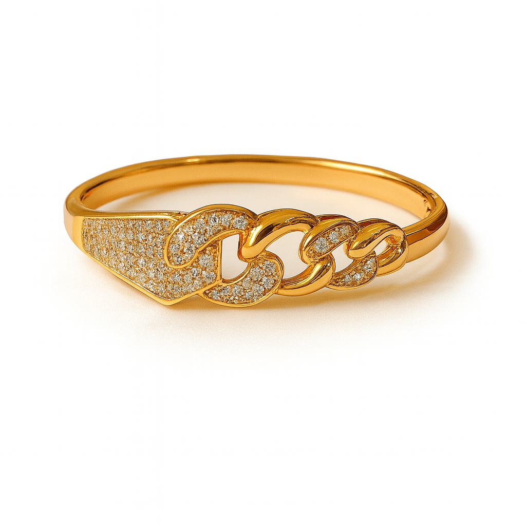 A sleek gold-plated bangle featuring a sculpted chain-link motif set with high-sparkle pavé crystals. The polished dome profile and smooth inner edges make it comfortable for daily wear while delivering refined party sparkle.