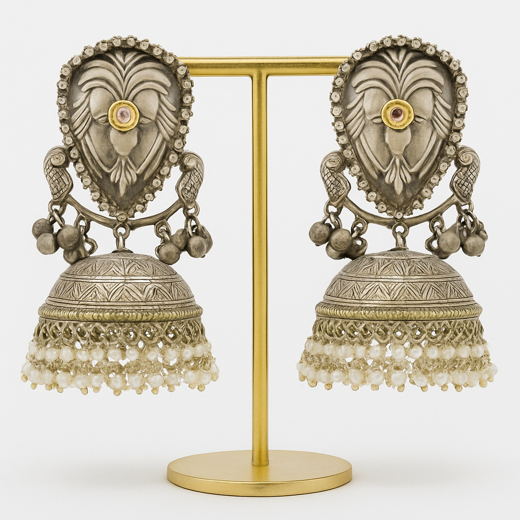 Celebrate timeless tradition with these oxidised bird motif pearl jhumkas, crafted with intricate carvings, delicate pearl danglers, and a touch of golden stone brilliance at the stud. A stunning piece that radiates elegance, perfect for weddings, festive occasions, and cultural celebrations.