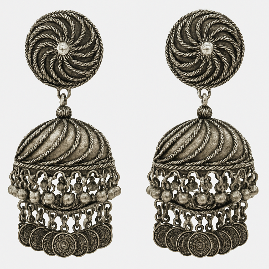 Embrace timeless tradition with these oxidised silver dome jhumka earrings, featuring intricate rope detailing and charming coin danglers. Designed for those who love authentic Indian ethnic jewelry, these earrings are perfect for festive occasions, weddings, and everyday cultural elegance.