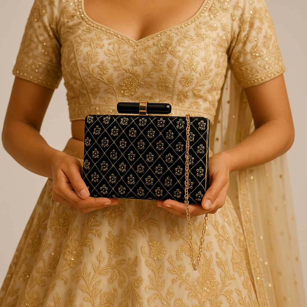 Add a touch of royal charm to your wardrobe with this Black Velvet Gold Floral Clutch – the statement accessory your festive and party looks deserve.