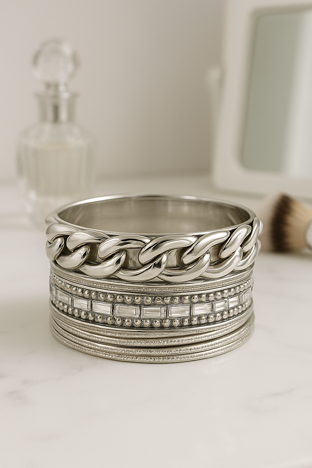 Elevate your style today—add this Silver Crystal Statement Bangles Set to your collection and let your accessories shine as bright as you do.